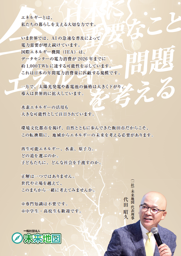 環境文化都市を掲げ、自然とともに歩んできた飯田市だからこそ、この転換期に、地域からエネルギーの未来を考える必要があります。